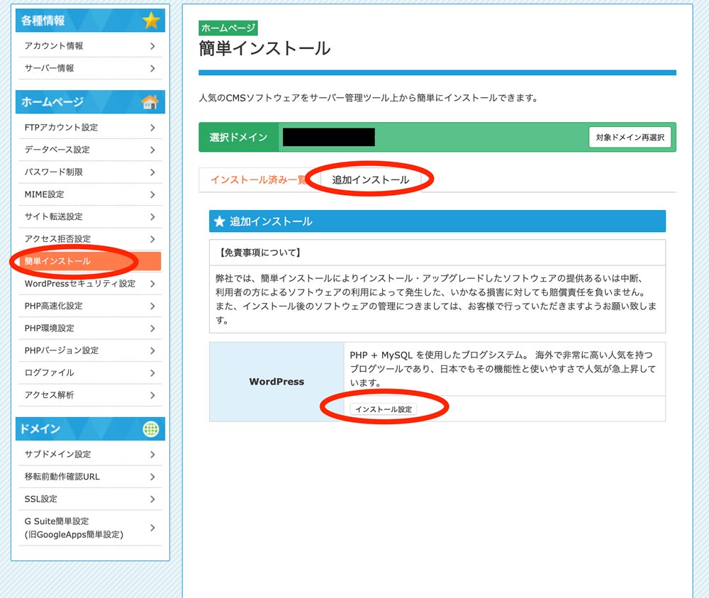 その機能は以下の画像の箇所から利用することが出来ます。簡単インストールの追加インストール内の『インストール設定』を選択して下さい。