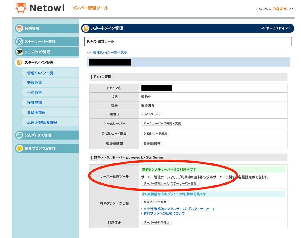 無料レンタルサーバーの申し込みが終わりましたら上の画像の赤丸にある『サーバー管理ツール(スターサーバー管理)』を選択して下さい。