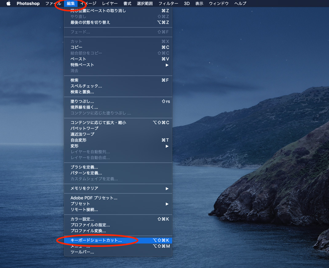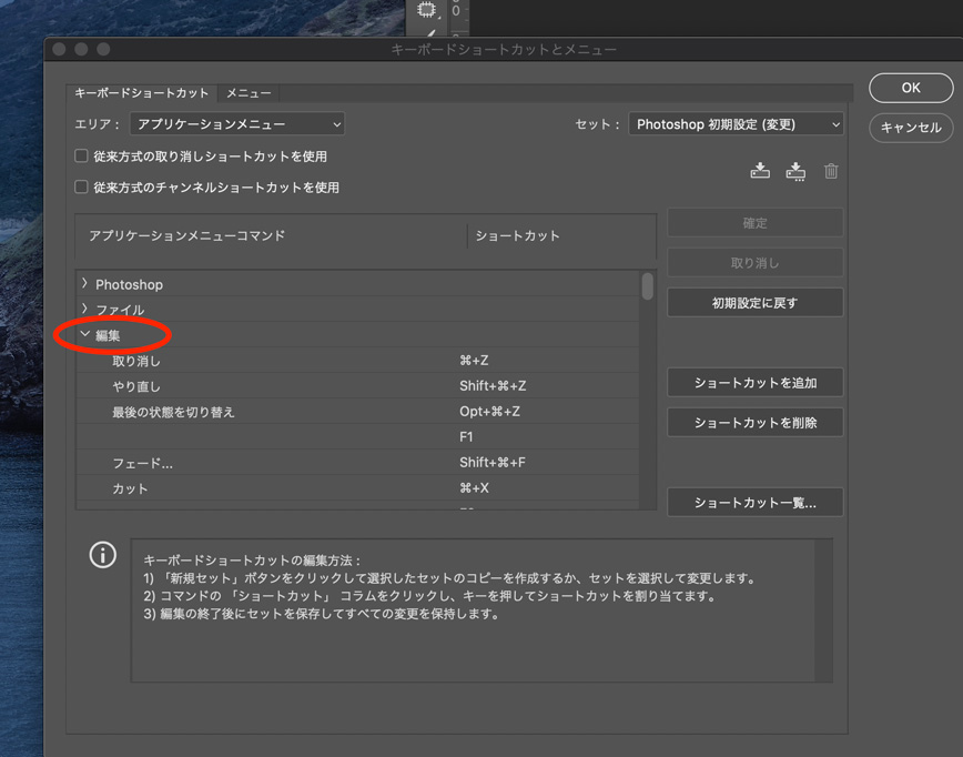 まずは上部にあるメニューバーから『編集』→『キーボードショートカット』を選択して下さい。