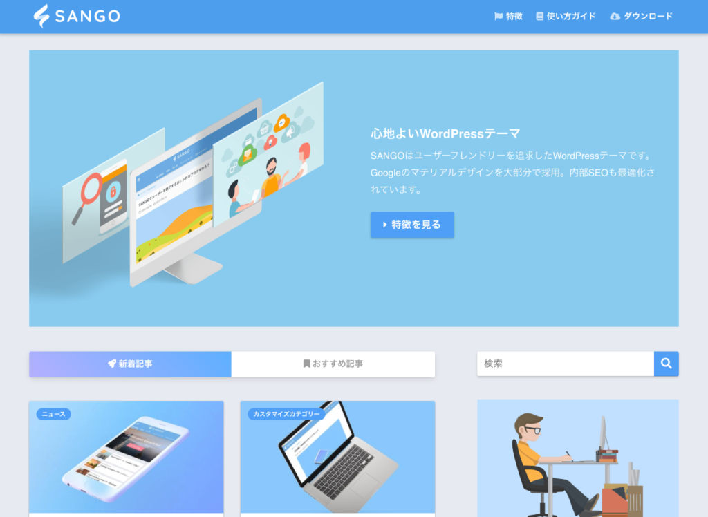 紹介しているWordPressテーマの中では後発にあたります。その為最新のトレンドに合った機能を持っているのが特徴です。またデザインもとても優れているのでオススメです。 |